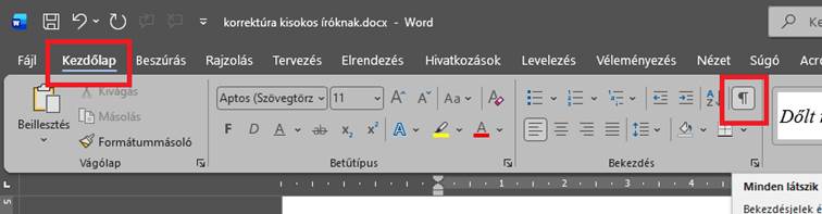 A soft entert és a nem elválasztható szóközt úgy lehet láthatóvá tenni a Wordben, ha a Kezdőlap fülön rákattintunk arra, hogy mindent mutasson, így pedig máris könnyen lehet javítani őket.