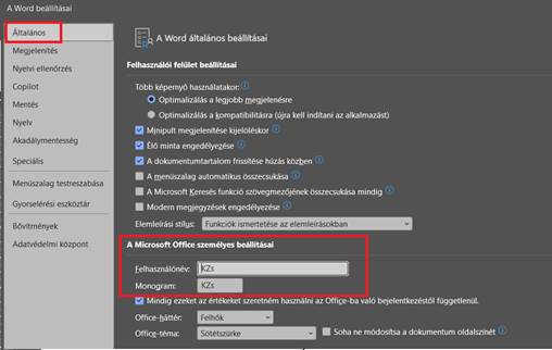 Hogy ehhez milyen nevet kapcsol a Word, az attól függ, hogy a Fájl > Beállítások > Általános beállításoknál mi szerepel a Felhasználónév és a Monogram helyén.