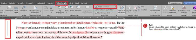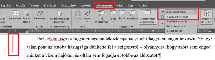 Az oldalsó piros/szürke függőleges vonalra kattintva egyszerűen lehet a Minden és az Egyszerű korrektúra között váltani.