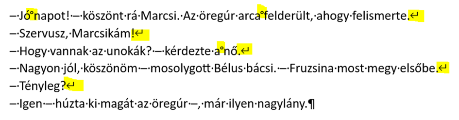 A másik, hogy a sorok végén ne használj puha entert (Shift+Enter), amit a sorvégi nyilacska jelöl a lenti képen, mert nagyon megnehezíti a formázást. A kis karika a „Jó napot” és „a nő” szavak között egy nem elválasztható szóközt jelöl (Ctrl+Shift+szóköz). Akkor szokott megjelenni, ha más szövegszerkesztőből másoltuk át a szövegünket Wordbe. Ezt is cserélni kell a szimpla szóközre.